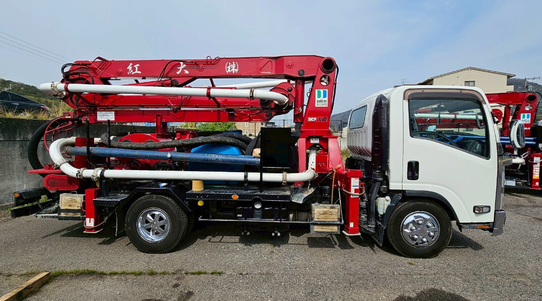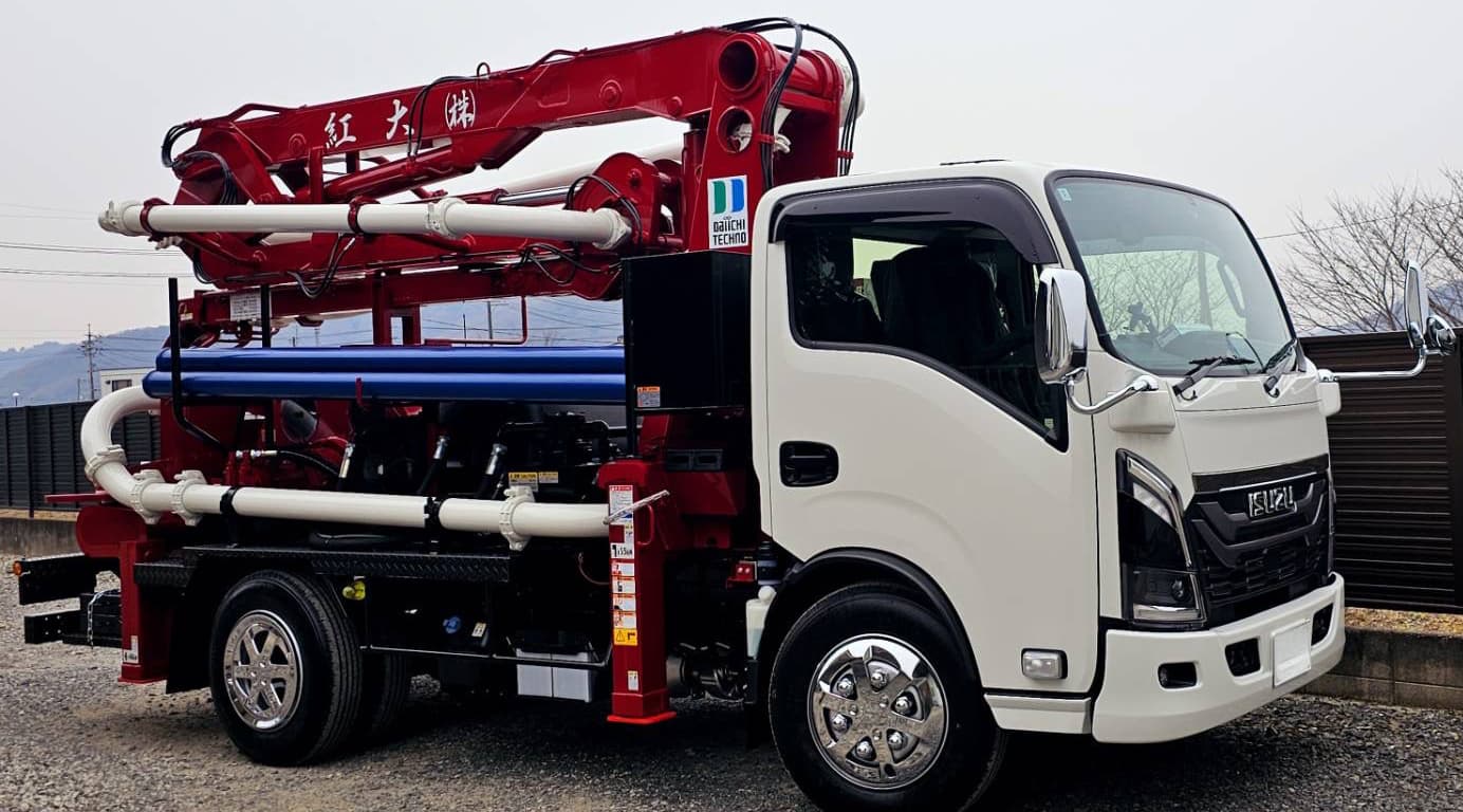 コンクリートポンプ車は、建設現場で生コンクリートを打設現場に圧送する自動車です。ミキサートラックなどで運ばれてきた生コンクリートを、ホッパで受け、ポンプ機構により輸送管を通して目的の場所へ圧送します。